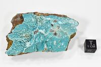 Коллекция Систематическая коллекция, №92623. Ярко-голубая сферолитовая корка глаукокеринита толщиной около 1мм на кавернозном смитсоните. Длина экспоната 8.0 см.