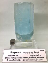 Коллекция Систематическая коллекция, №92694. Голубой призматический столбчатый кристалл аквамарина размером 10х5х4,5см Длина экспоната 10 см.Размер минерала 10 см.