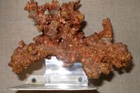 Коллекция Систематическая коллекция, №92730. Крупный дендритовый сросток кристаллов меди размером до 1,5см на которых видны грани куба, октаэдра, другие формы. С реликтами церуссита и ярозита. Длина экспоната 15.0 см.