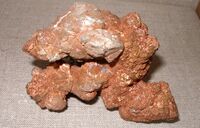 Коллекция Систематическая коллекция, №92908. Белесые тонкие кристаллические пленки серебра на крупных до 2см кривогранных кристаллах самородной меди. Длина экспоната 10 см.