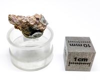 Коллекция Систематическая коллекция, №92952. Голубовато-серые зерна осумилита-(Mg) размером до 0,5мм в вулканической породе Длина экспоната 1.5 см.Размер минерала 0.01 см.