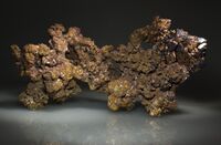 Коллекция Систематическая коллекция, №93214. Дендритовый агрегат кристаллов меди включающий октаэдрические кристаллы куприта размером до 3см частично или полностью замещенные медью. Кристаллы меди участками покрыты пленками серебра. Размер образца в максимальном измерении - 24см. Длина экспоната 24.0 см.