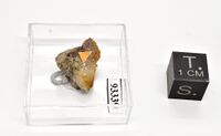 Коллекция Систематическая коллекция, №93339. Очень мелкие оранжевые кристаллы марккуперита на поверхности на кварце Длина экспоната 1.5 см.
