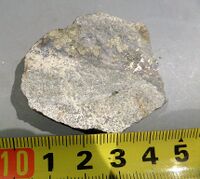 Коллекция Систематическая коллекция, №93362. Выпиленная пластинка толщиной около 1мм с кварцевым прожилком с сульфидами и теллуридами в котором присутствует и джонассонит Длина экспоната 5.0 см.