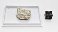 Коллекция Систематическая коллекция, №93373. Желтые порошковатые агрегаты карлосбарбосаита (Ca0.5o0.5)(UO2)2(NbSi)O6(OH)2·2H2O в пустотах в полевом шпате Длина экспоната 4.0 см.