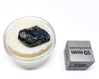 Коллекция Систематическая коллекция, №93374. Черный хорошо образованный кристалл фторкалийпаргасита размером 2см призматического габитуса. Длина экспоната 2.0 см.Размер минерала 2.00 см.