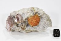 Коллекция Систематическая коллекция, №93453. Оранжевое (цвета кураги) изометричное зерно спессартина размером 3 см в кварц-полевошпатовом пегматите с лепидолитом. Длина экспоната 9.0 см.Размер минерала 3.00 см.