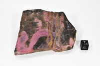 Коллекция Систематическая коллекция, №93460. Тонкозернистый оранжево-коричневый спессартин с серым тефроитом образует будиноподобные обособления в родоните, вероятно, с сонолитом (малиновый). Длина экспоната 9.0 см.