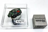 Коллекция Систематическая коллекция, №93477. Фрагмент базальтовой лавы размером около 1.5см с пустотами, содержащими отдельные тонкие игольчатые темно-красные кристаллы псевдолионсита длиною до 0,15 мм, ассоциирующие с зеленым пийпитом, гематитом, афтиталитом Длина экспоната 1.5 см.