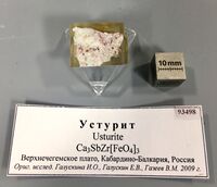 Коллекция Систематическая коллекция, №93498. Пласиковая запрессовка для микрозонда, содержащая образец с битиклеитом -(SnFe). В ассоциации - кумтюбеит, эттрингит, гиббшит, вадалит. Голотип. Длина экспоната 2.5 см.Размер минерала 0.04 см.