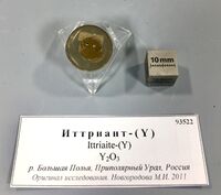 Коллекция Систематическая коллекция, №93522. Препарат для микрозонда с зернами пирита и вольфрама (изометричное сложной формы размером около 500 микрон). Идиоморфные зерна иттриаита-(Y) размером до 8 микрон рассеяны в вольфраме. Голотип иттриаита-(Y). Длина экспоната 1.8 см.