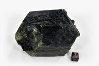 Коллекция Систематическая коллекция, №93566. Темно-зеленый пинакоидально-призматический вытянутый по оси b (вдоль оси симметрии второго порядка) кристалл эпидота размером около 10см. Часть граней присыпана мелкими кристалликами фисташкового эпидота, титанита и магнетита. Длина экспоната 10 см.Размер минерала 10 см.