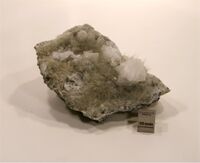 Коллекция Систематическая коллекция, №93599. Агрегат серых волосовидных кристаллов тремолита длиною более сантиметра с белыми кристаллами адуляра размером до 1.5см на поверхности трещины в сланце. Длина экспоната 12.0 см.