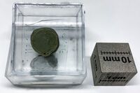 Коллекция Систематическая коллекция, №93635. Кристалл ярошевскита Cu9O2[VO4]4Cl2 размером около 0.3 мм Длина экспоната 0.1 см.