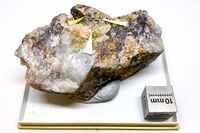 Коллекция Систематическая коллекция, №93752. Белые с жемчужным отливом мелкие кристаллы красноита, темно-зеленые изометричные образования плимерита и желтовато-зеленые сферолиты кунатита в пустоте в кварце с халькосидеритом. Длина экспоната 7.0 см.