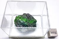 Коллекция Систематическая коллекция, №93946. Корочки мелких травяно-зеленых кристаллов на поверхности вулканического шлака в ассоциации с халькантитом(?). Длина экспоната 3.5 см.