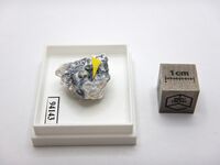 Коллекция Систематическая коллекция, №94143. Шестоватый агрегат бесцветных кристаллов кальцинаксита в кварцевом ксенолите из базальта. С тоберморитом и эттринггитом Длина экспоната 2.0 см.