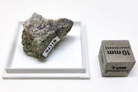 Коллекция Систематическая коллекция, №94318. Зеленовато-серый скрыто-волокнистый агрегат перманганогрюнерита в полосчатом доломитовом агрегате с пиритом, сфалеритом и кварцем. Длина экспоната 2.5 см.