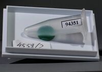 Коллекция Систематическая коллекция, №94351. Мелкие бледно-розовые пластинчатые фрагменты маршаллзюссманита в капсуле.