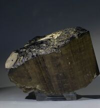 Коллекция Систематическая коллекция, №94360. Фрагмент (головка) стобчатого зеленовато-коричневого кристалла эльбаита с узкой розовой зоной вблизи периферии. Длина экспоната 9.0 см.