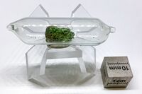 Коллекция Систематическая коллекция, №94382. Желтовато-коричневые агрегаты романорловита с ярко-зеленым авдонинитом, хлоротионитом, бесцветными каинитом и сильвином. Образец запаян в стеклянную ампулу. Длина экспоната 1.0 см.Размер минерала 0.10 см.