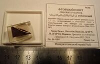 Коллекция Систематическая коллекция, №94386. Фрагмент образца ларнитовой породы размером около 1,7 см запрессованный в эпоксидную смолу и подготовленный как препарат для микрозонда. Голотип нового минерала фторкюйгенита (IMA 2013-043). Пока нет данных с изображением и анализом. Длина экспоната 1.7 см.