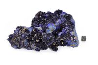 Коллекция Систематическая коллекция, №94427. Кавернозный малахит-азуритовый агрегат, полости которого выполнены расщепленными кристаллами азурита (плоскостное расщепление) размером до 0.8 х 0.8 х 1.2 см. На кристаллах азурита агрегаты мелкокристаллического церуссита размером 3 х 3 мм и отдельные тетраэдрические кристаллы желтого майерсита размером до 1 мм. Длина экспоната 16.0 см.