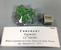 Коллекция Систематическая коллекция, №94481. Зеленовато-коричневые рыхлые агрегаты состоящие из смеси гвианаита, амезита и уваровита. Длина экспоната 3.0 см.