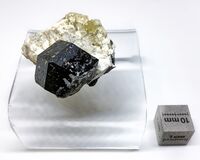Коллекция Систематическая коллекция, №94602. Кристалл Ti-андрадита ромбододекаэдрического габитуса на агрегате кальцита и натролита. Длина экспоната 4.0 см.Размер минерала 2.50 см.
