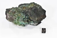 Коллекция Систематическая коллекция, №94921. Густо-зеленый эриклаксманит, образующий частичные псевдоморфозы по таблитчатым кристаллам бирюзового урусовита с зеленовато-голубым ламмеритом, травяно-зеленым козыревскитом, теноритом и гематитом на базальтовом шлаке. Длина экспоната 12.0 см.