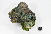 Коллекция Систематическая коллекция, №94923. Обильная оливково-зеленая с желтоватым оттенком корка поповита с густо-зеленым эриклаксманитом, бирюзовым урусовитом и теноритом.на вулканическом шлаке. Длина экспоната 9.0 см.