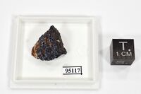 Коллекция Систематическая коллекция, №95117. Красно-коричневые микрокристаллы кораллоита в агрегате оксидов марганца. Длина экспоната 2.0 см.