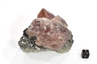 Коллекция Систематическая коллекция, №95129. Октаэдрический розовый кристалл флюорита размером 6 см (по ребру октаэдра), рассеченный кальцитовым прожилком, на друзе кристаллов арсенопирита, нарастающей на зеленоватый радиально-лучистый геденбергит. Длина экспоната 9.0 см.Размер минерала 6.00 см.