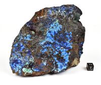 Коллекция Систематическая коллекция, №95180. Плоские сферолиты голубого цианотрихита диаметром до 5 мм, рыхловатые пленки светло-зеленого малахита и гнезда и линзочки темно-синего азурита на плотной лимонитовой породе. Длина экспоната 15.0 см.