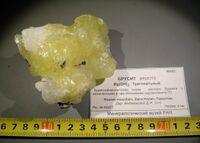 Коллекция Систематическая коллекция, №95423. Крупносферолитовая корка желтого брусита с включенными в нее обломками серпентинита. Длина экспоната 8.0 см.