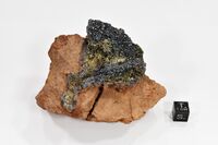Коллекция Систематическая коллекция, №95533. Щетка блестящих октаэдрических кристаллов магнетита размером до 3 мм на обожженной породе. Длина экспоната 9.0 см.