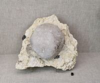 Коллекция Систематическая коллекция, №95534. Бесцветный тетрагонтриоктаэдр поллуцита размером 18 см со следами растворения на гранях. На выветрелом альбите с микроклином и отдельными кристаллами шерла. Длина экспоната 31.0 см.Размер минерала 18.00 см.