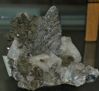 Коллекция Систематическая коллекция, №95542. Расщепленный вытянутый (длина 7 см) кристалл леллингита в кварц-доломитовой друзе с обросшими корочками сидерита кристаллами кварца. Длина экспоната 14.0 см.Размер минерала 7.00 см.