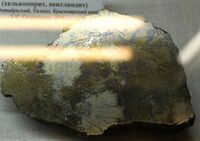 Найден: рудник Октябрьский, Октябрьское месторождение, Норильск, Красноярский край, Россия, Росcия.Минералы-спутники: Талнахит, Галенит, Пентландит.