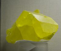 Коллекция Систематическая коллекция, №95601. Изометричный хорошо ограненный ярко-желтый, просвечивающий кристалл серы размером около 22 см Длина экспоната 22.0 см.
