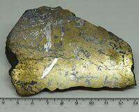 Коллекция Систематическая коллекция, №95661. Два пластинчатых зерна паоловита размером 2х18 и 3х16 мм с прерывистой каймой атокита и секущими тонкими прожилками нигглиита среди графических срастаний халькопирита и галенита. Шлифованная пластина 9х7х1,5 см. Длина экспоната 9.0 см.Размер минерала 2.20 см.