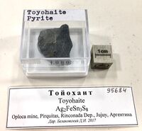 Коллекция Систематическая коллекция, №95684. Мелкозернистый кварц-пиритовый агрегат с бронзово-коричневыми мелкозернистыми пирротиноподобными гнездами тойохаита и редкими мелкими (n*10 микрон) зернами сфалерита. Сфалерит также образует мелкокристаллическую коричневую щетку на кварце. Длина экспоната 3.0 см.