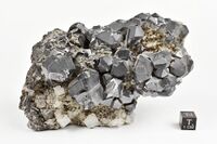 Коллекция Систематическая коллекция, №95711. Сросток кубоктаэдрических кристаллов галенита размером 0,5 - 2 см с кубиками бесцветного флюорита (до 0,6 см) и мелкокристаллическим кварцем на буровато-черном сфалерите. Размер образца 12х7 см. Длина экспоната 12.0 см.