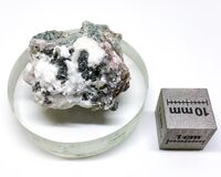 Коллекция Систематическая коллекция, №95716. Сыпь из темно-зелёных до черного мелкочешуйчатых сферолитов промежуточного члена ряда пумпеллит-(Fe3+) - пумпеллит-(Fe2+) размером до 2 мм на белом волокнистом окените и бесцветном кальците Длина экспоната 3.0 см.