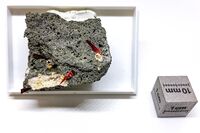 Коллекция Систематическая коллекция, №95733. Розоватые вытянутые кристаллы ферриобертиита в полости с бесцветным санидином (?) в базальте с включениями другого амфибола. Длина экспоната 4.0 см.
