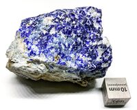 Коллекция Систематическая коллекция, №95749. Гнездо размером около 2 х 3.5 х 4 см насыщенно-синих зерен и кристаллов владимиривановита размером до 2 мм с серовато-голубым тункитом и кальцитом в плагиоклаз-кальцитовой породе. Длина экспоната 6.0 см.