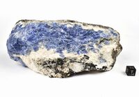 Коллекция Систематическая коллекция, №95761. Крупное обособление синего содалита, сложенное гигантозернистым агрегатом (размер зерен до 4 см) замещенный по периферии белым агрегатом (натролит +) с прерывичтой биотитовой оторочкой в миаските. Длина экспоната 18.0 см.