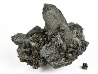 Коллекция Систематическая коллекция, №95831. Друза кристаллов прозрачного кварца, крупнейший из которых 9 х 6 см с густой присыпкой мелкого хлорита и отдельными коричневыми кристаллами титанита размером до 1 см. Длина экспоната 15.0 см.Размер минерала 10 см.