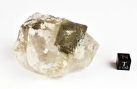 Коллекция Систематическая коллекция, №95839. Зеленовато-серый октаэдрический кристалл сульфогалита размером около 3 см на на бесцветном кристалле галита. Длина экспоната 7.0 см.Размер минерала 3.00 см.