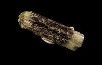 Коллекция Систематическая коллекция, №95842. Кристалл зонального турмалина размером 6 х 1.8 х 1.8 см весом около 35 грамм с зеленой вершиной, ограненной тригональной пирамидой, черной основной частью, сменяющейся бесцветной у противоположной вершины, которая огранена пологой тригональной пирамидой и окрашена в синий цвет. Длина экспоната 6.0 см.